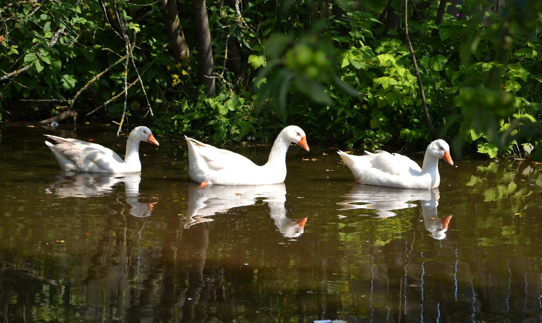 Гусей слышно издалека, особенно главного белого гуся, он всегда ведет себя как настоящий хозяин, защищает семейство.