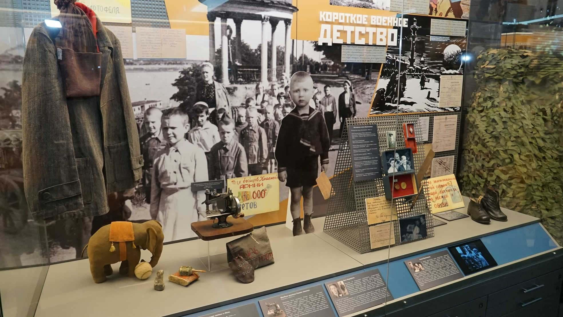 Важной темой музейной экспозиции является военное детство: о нем рассказывают детские рисунки военного времени, вещи и игрушки, документы о труде детей и подростков в годы войны.