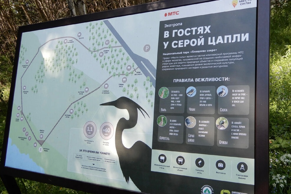 A 1 km long hiking ecological route runs in the open coastal part of the Northeastern shore of Lake Pleshcheyeva, directly adjacent to its water area. The duration is 1-1.5 hours. There is a wooden deck along the route, an observation tower on the lake shore and three information stands. Having traveled along the ecological trail "Visiting the Gray Heron", you can get acquainted with the birds living here (about 50 species) and the peculiarities of their biology, as well as admire the natural beauties of the Pleshcheyevo Lake National Park. Free access to the route is available if you have permission to visit the territory of the Pleshcheyevo Lake National Park