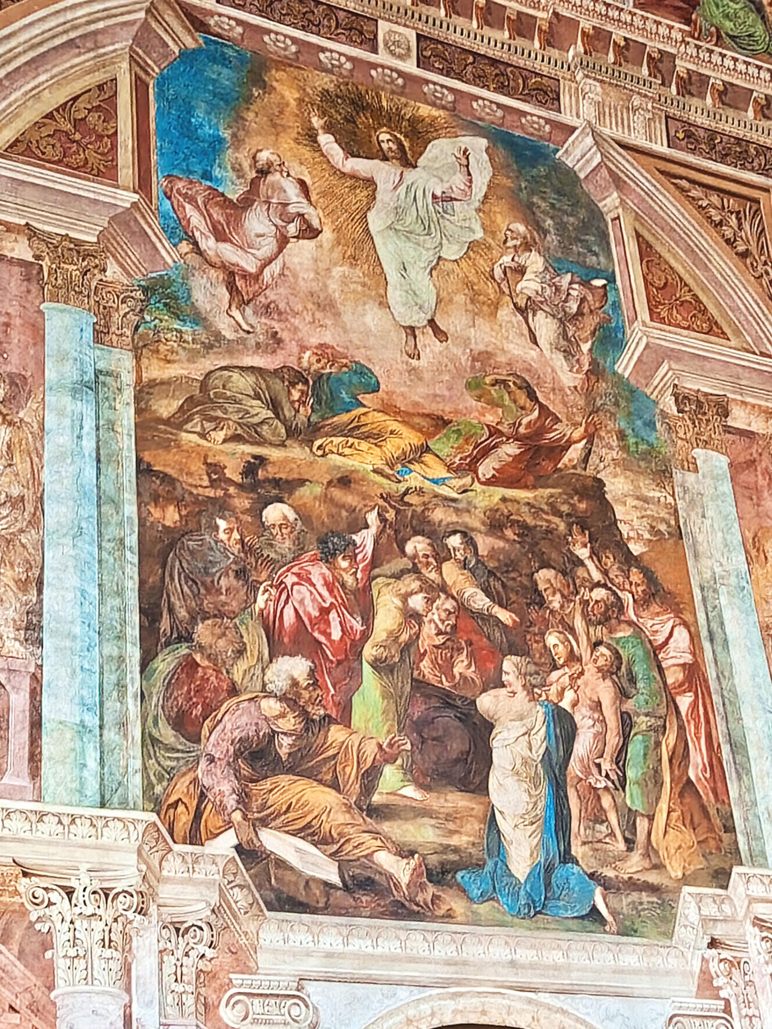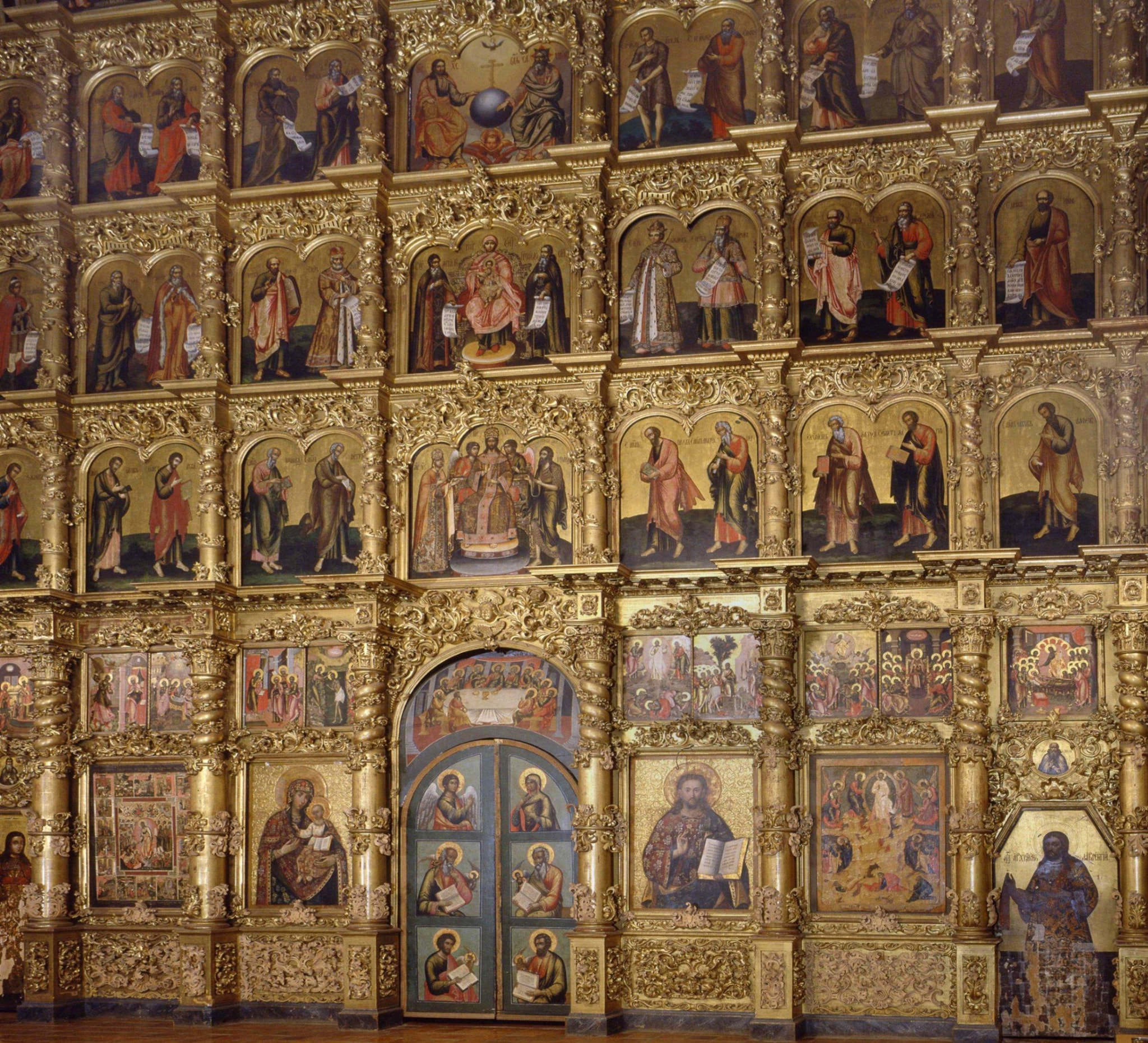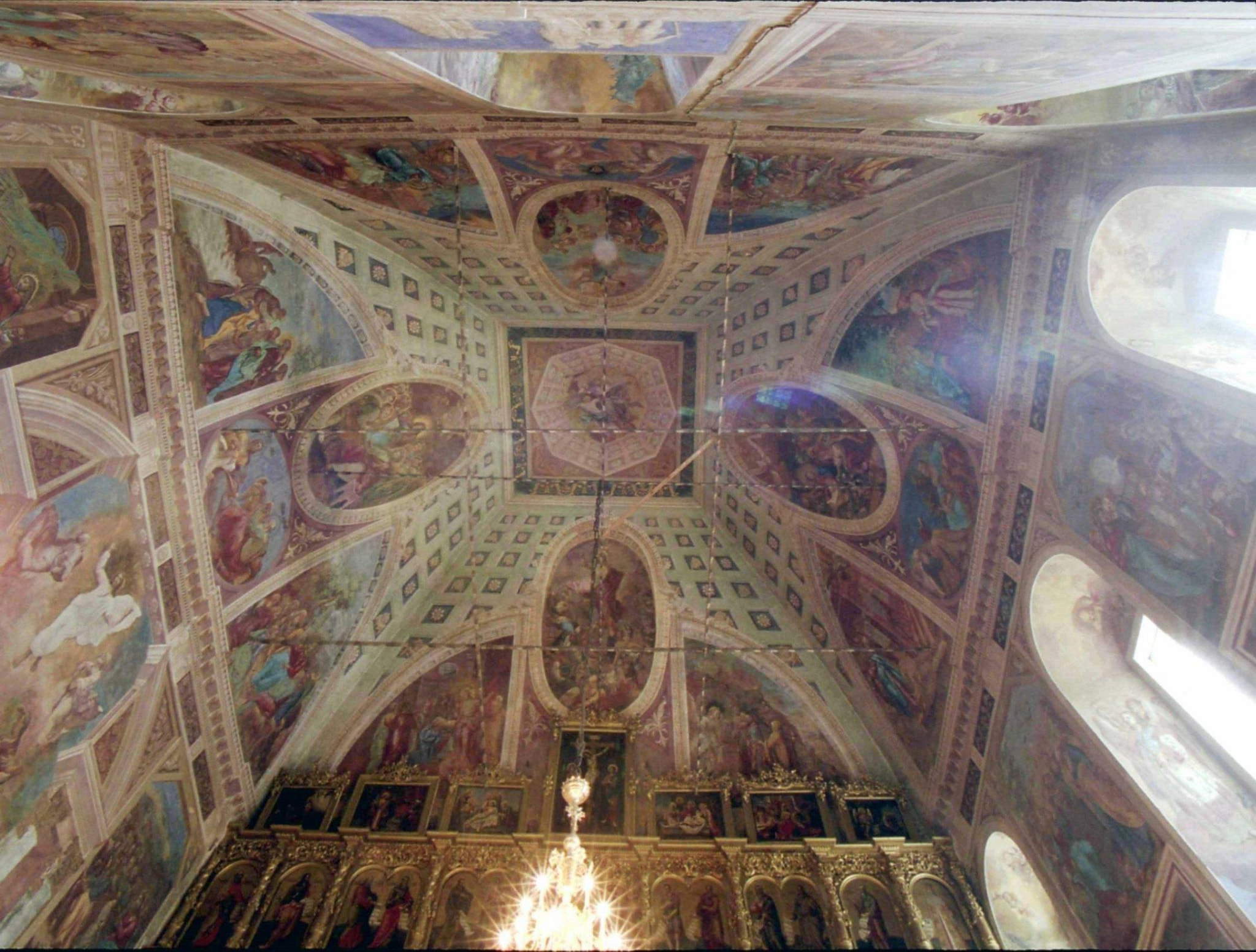 На широких плоскостях стен и сводов храмовой части размещается более 50 композиций, выполненных в начале XIX века по образцам европейских мастеров позднего Возрождения и барокко. Величественный золоченый иконостас в стиле барокко с пышной резьбой довершает композицию внутреннего убранства.