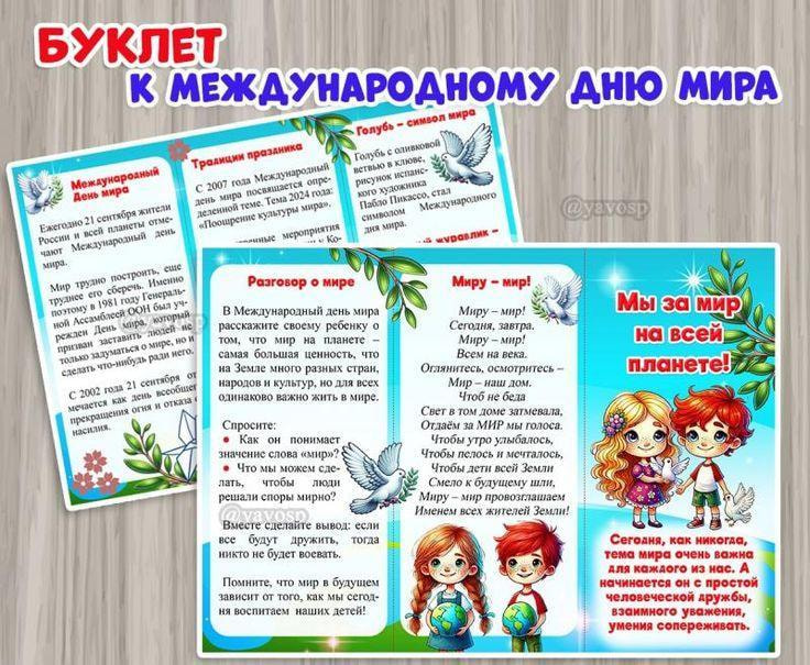 Международный день мира олицетворяет гармонию между народами и уважение к культурным и религиозным особенностям разных сообществ. В этот праздник люди по всему миру объединяются в борьбе с агрессией и насилием. День был учрежден Генеральной Ассамблеей ООН в 1981 году. В этот день мы задумываемся о своих поступках и том, что сделали для мира. Символом мира является голубь с оливковой ветвью, созданный Пабло Пикассо. Важно, чтобы над нашими головами было мирное небо. Стабильность позволяет учиться, работать, создавать семьи и реализовывать свои права, а также расти духовно и нравственно. В нашем селе к этому празднику будут распространены буклеты с названием «Мы за мир на всей планете». Каждый может внести свой вклад в сохранение мира, прекратив равнодушие и осознав, что проблемы касаются всех.