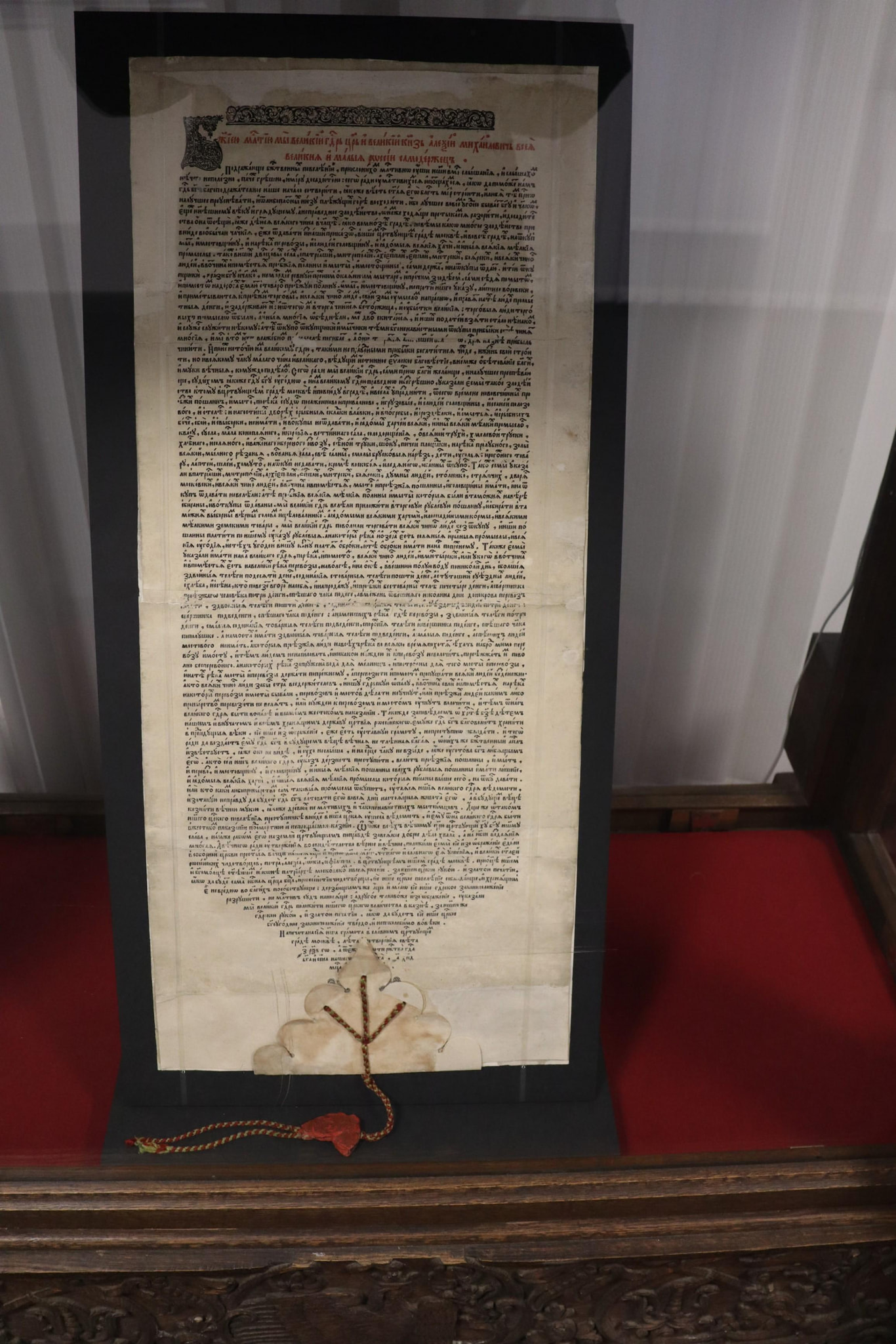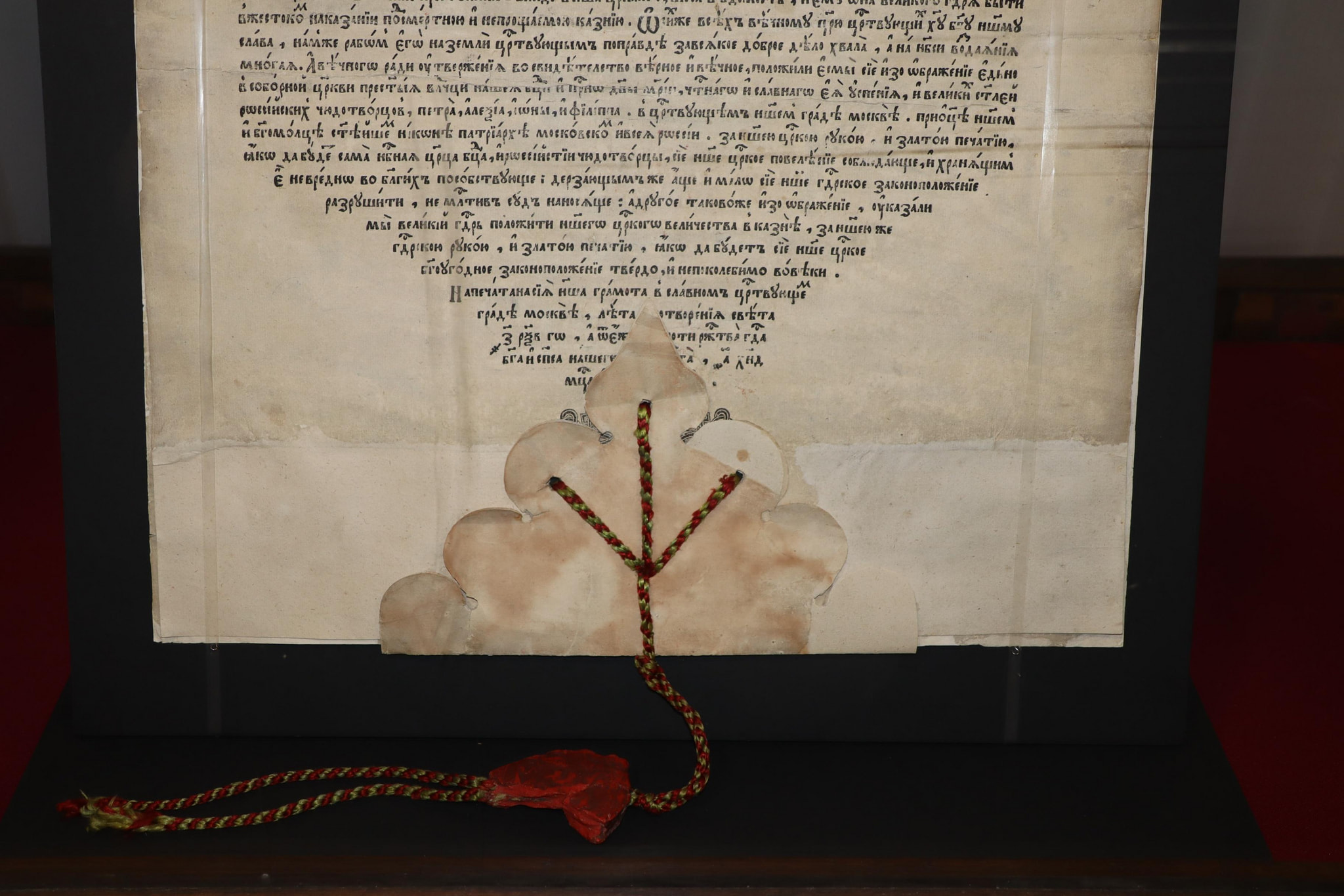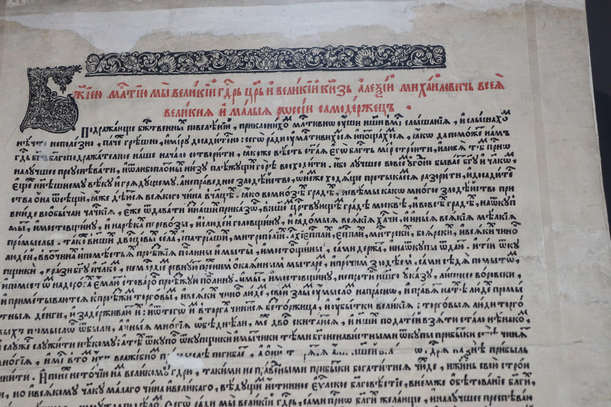 На выставке представлена Уставная таможенная грамота царя Алексея Михайловича от 30 апреля 1654 года «О злоупотреблениях, происходящих от отдачи на откуп мытов, мостов, перевозов, съестных и других припасов, о стеснении тем народной промышленности и об уменьшении для сего некоторых налогов».