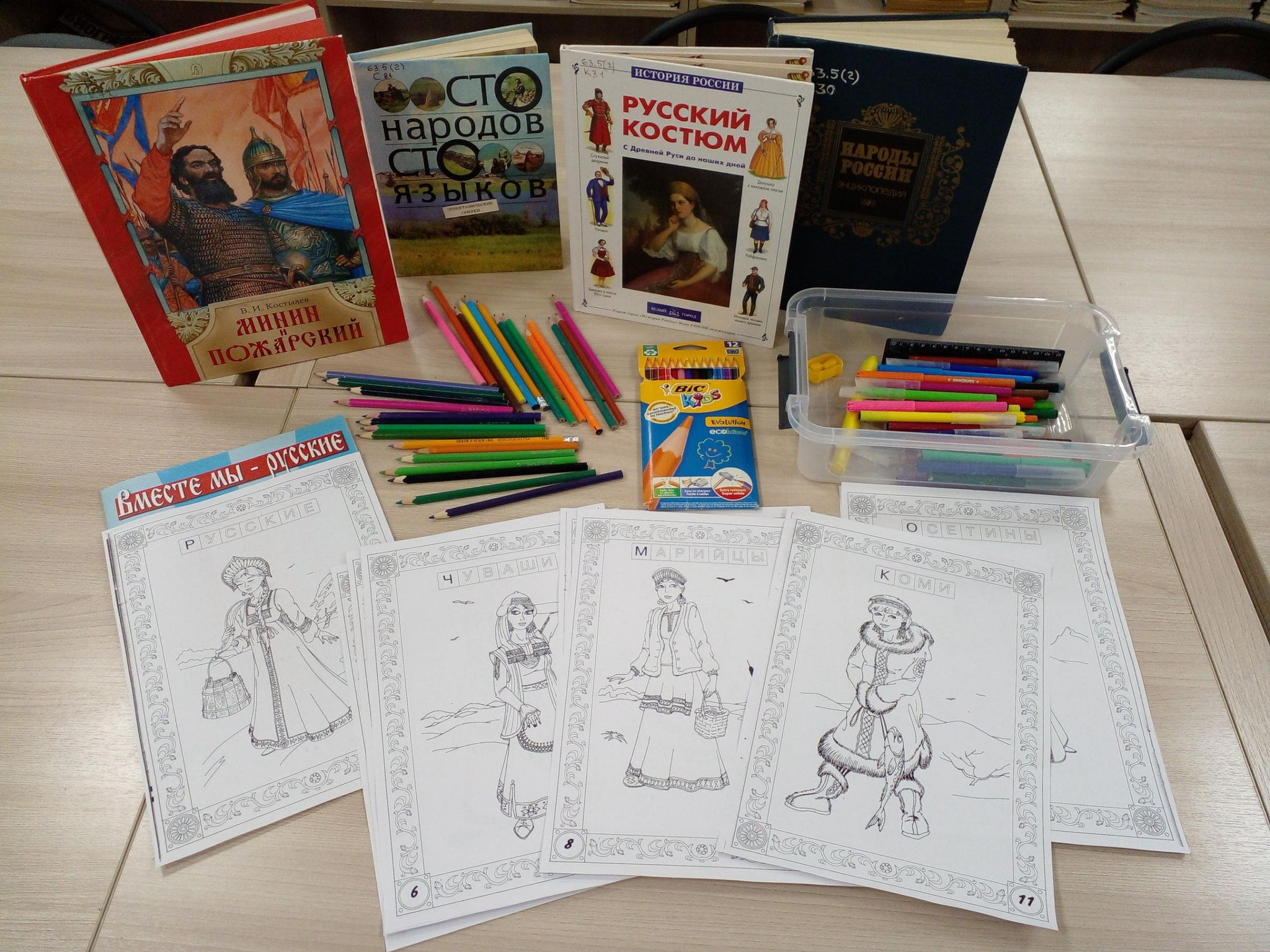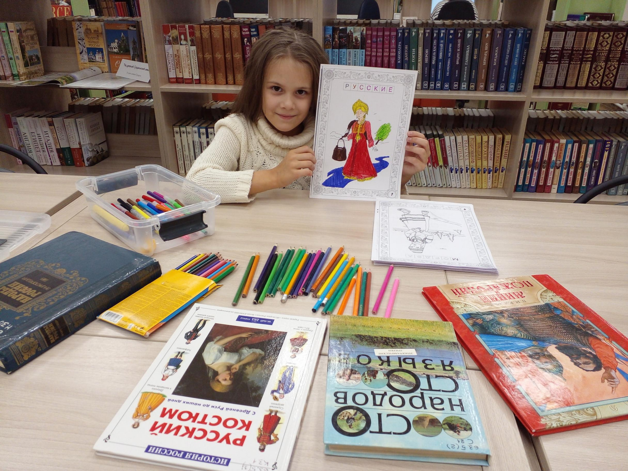 Все желающие смогут проявить творчество и с помощью цветных карандашей и фломастеров раскрасить национальные костюмы. Правильно передать особенности костюма помогут энциклопедии и книги из книжного фонда библиотеки, представленные на выставке.