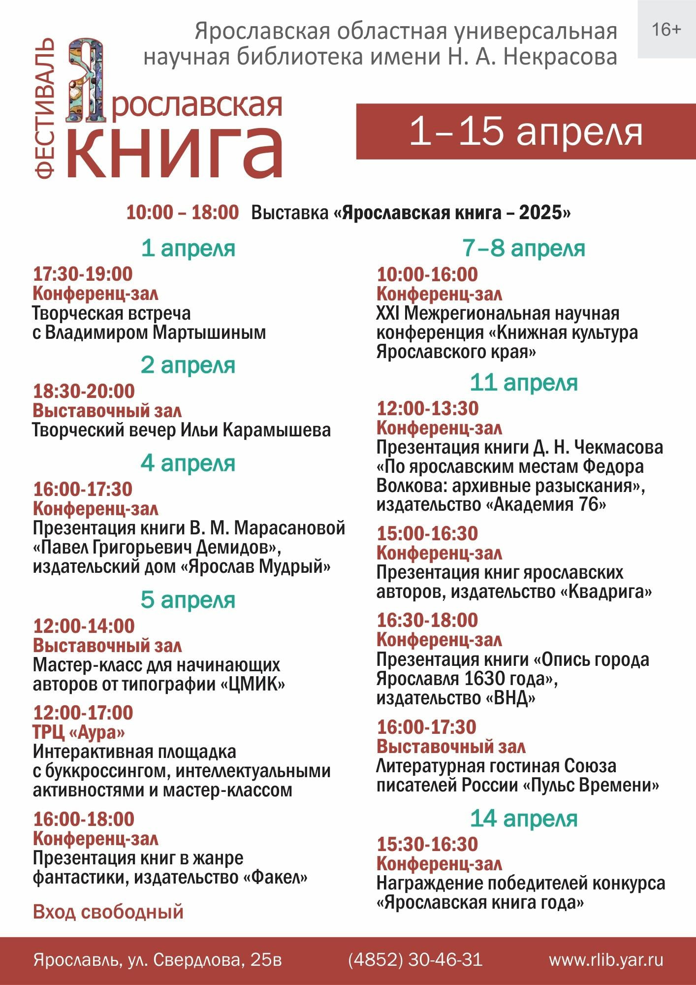 Центральным событием станет выставка более 300 изданий, поступивших в фонд библиотеки в 2025 году. Эти книги примут участие в конкурсе «Ярославская книга года», где авторитетное жюри определит победителей в профессиональных номинациях, а посетители смогут проголосовать за понравившееся издание в номинации «Выбор читателя».
