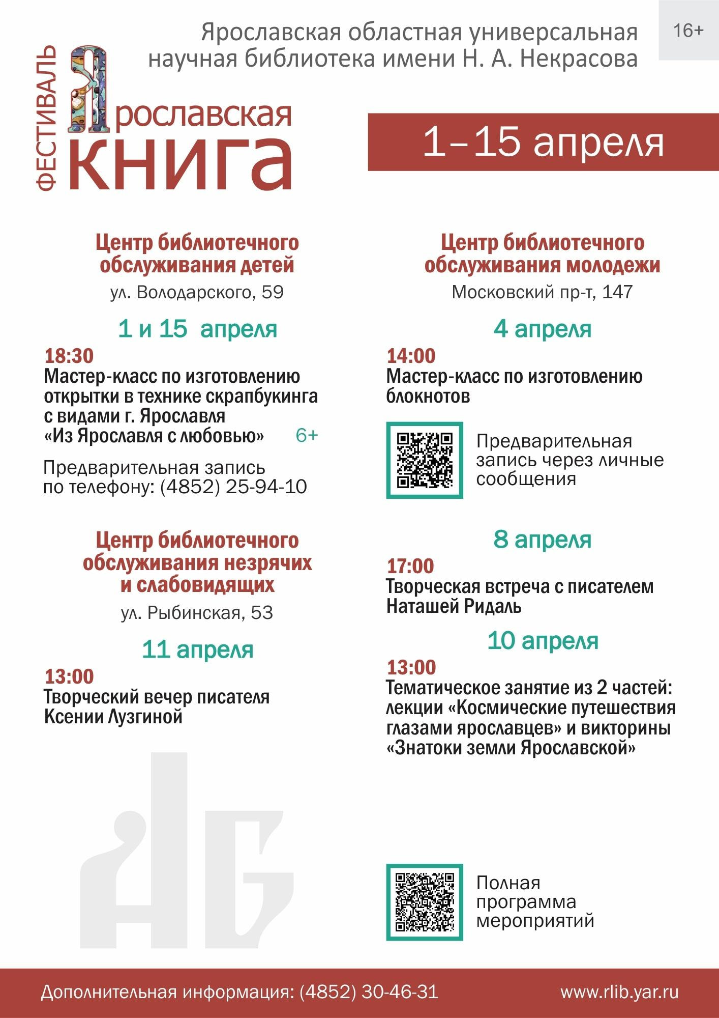 Центр библиотечного обслуживания молодежи подготовил насыщенную программу: творческая встреча с автором ретродетективов Наташей Ридаль (издательство «Факел»), где гости узнают о переплетении вымышленных персонажей с реальными историческими личностями начала XX века; мастер-класс по изготовлению блокнотов, а также тематическое занятие из двух частей – лекции «Космические путешествия глазами ярославцев» (о роли региона в освоении космоса и Валентине Терешковой) и викторины «Знатоки земли Ярославской», посвященной истории и культуре края.