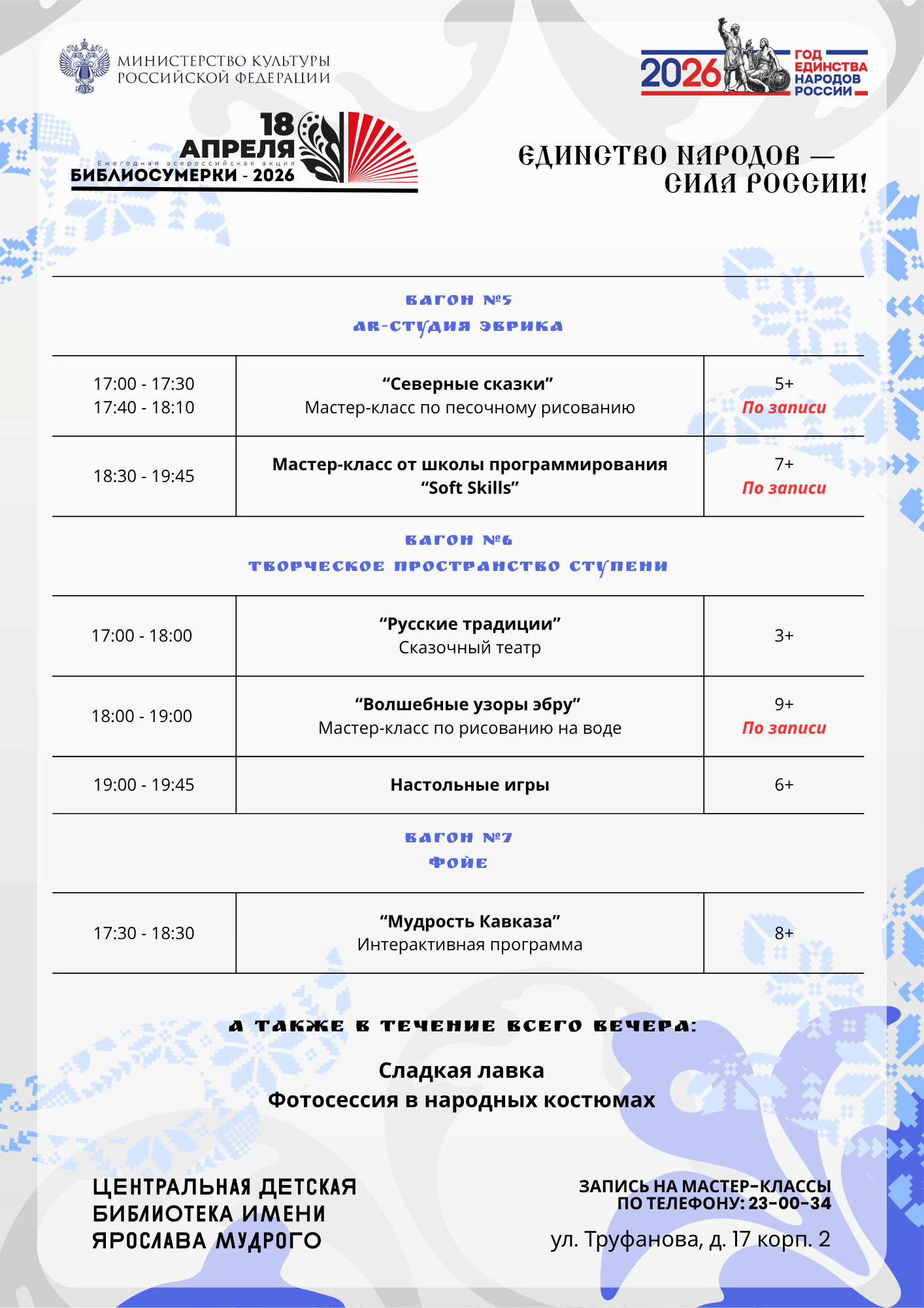 Обращаем внимание, что отдельные мастер-классы требуют предварительной записи. Для регистрации участники могут позвонить по телефону 23-00-34.
