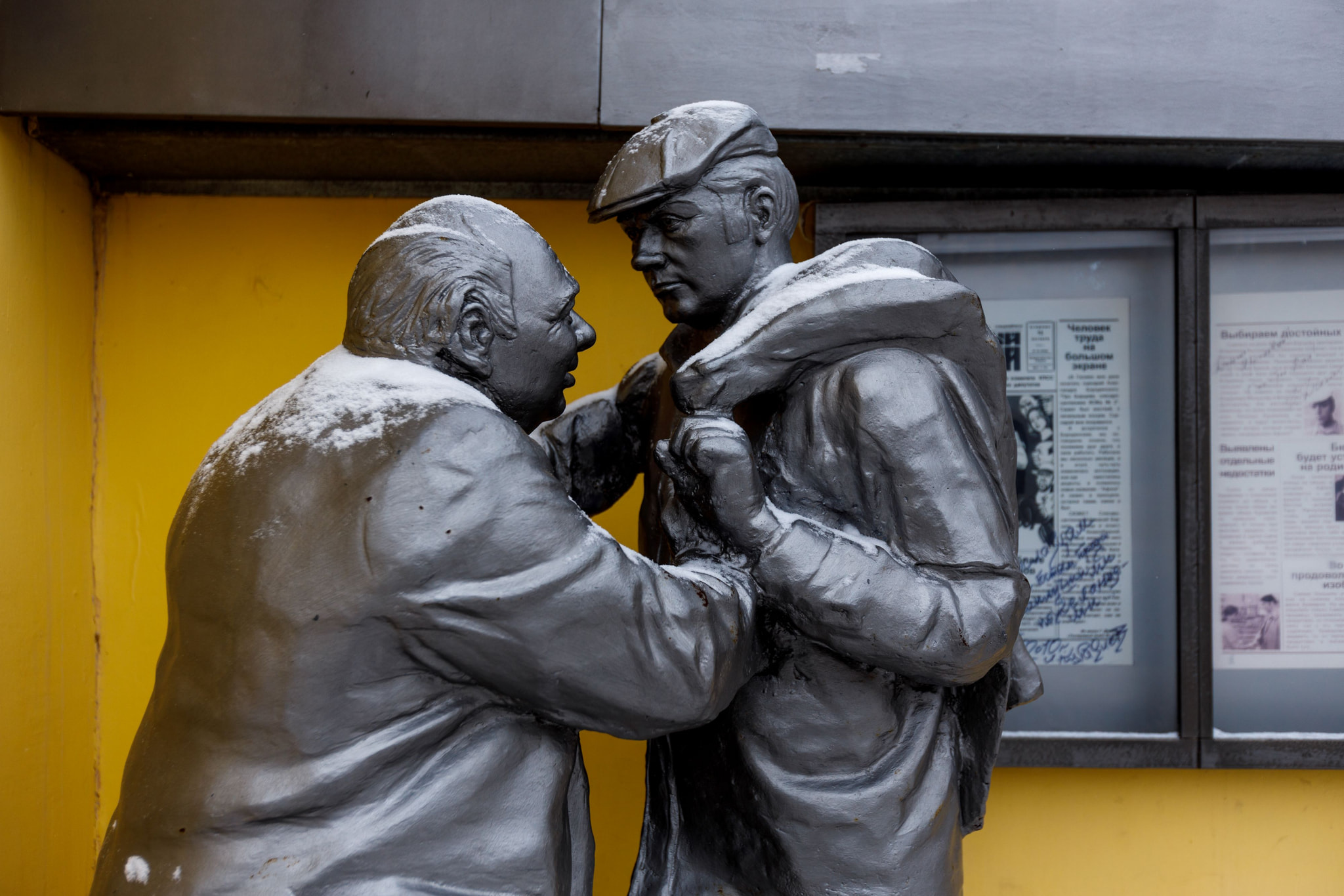 Работал над композицией скульптор Алексей Коршунов. Он изобразил персонажей Куравлева и Леонова во весь рост, беседующими друг с другом. На ступенчатый постамент очень легко забраться и составить парочке компанию. Многие туристы фотографируются, панибратски приобняв обоих приятелей или облокотившись на штукатура Колю. На стене здания, возле которого находится скульптура, под стеклом висит газета с заметками о съемках «Афони», автографами актеров и режиссера.