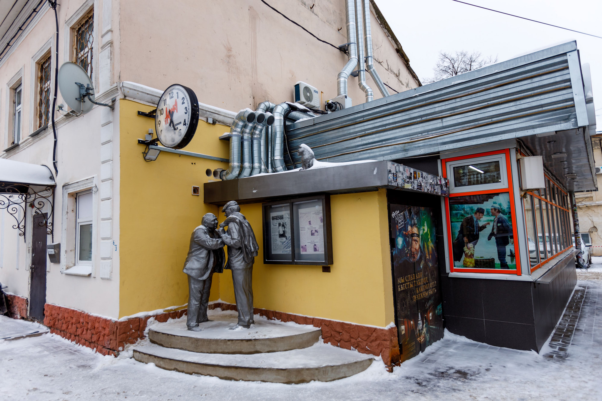 Любопытно, что находится скульптура не где-нибудь, а возле колоритной пивной «Афоня». Заведение, понятное дело, оформлено в советской стилистике: граненые стаканы, белые чепцы буфетчиц, вобла на закуску. Прямо на деревянных столах вырезаны цитаты из любимого фильма: «Тостуемый пьет до дна!», «Гони рубль, родственник!» и многие другие. Это же кино все время крутят по телевизору: погружение получается полное. Правда, места здесь довольно мало, а посетителей бывает достаточно, так что иногда не хватает столов. Зато пива хватает всегда.