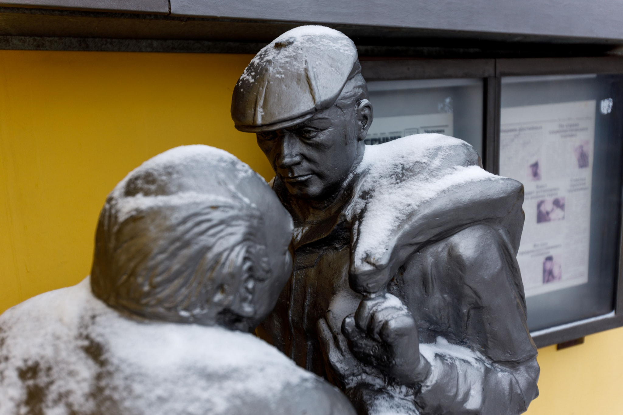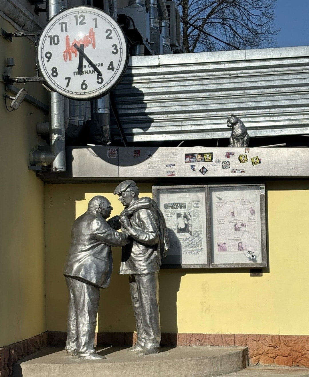 Рядом с памятником – большие круглые часы, а сверху на героев смотрит черный кот. Когда будете делать фото, постарайтесь, чтобы кот попал в кадр.